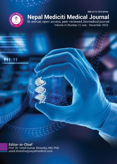 Nepal Mediciti Medical Journal (NMMJ) is the official journal of Ashwins Medical College and Hospital (Nepal Mediciti), Bhaisepati, Lalitpur, Nepal. It is a peer reviewed, biomedical journal [ISSN 2773-7810 (print)] and publishes the research based articles from the field of biomedical sciences which include Medicine, Surgery, Obstetrics and Gynaecology, Psychiatry, Paediatrics, Orthopaedics, Otorhinolaryngology, Ophthalmology, Anaesthesiology, Dermatology, Radio-diagnosis & Radiotherapy, Dental, Forensic Medicine, Pathology, Anatomy, Biochemistry, Community Medicine, Microbiology, Pharmacology, Physiology and other allied biomedical disciplines. The journal is published twice a year (January-June and July-December). Each issue of NMMJ publishes Original Articles, Review Articles, Case Reports, Viewpoint, Editorials and Letters to the Editor.